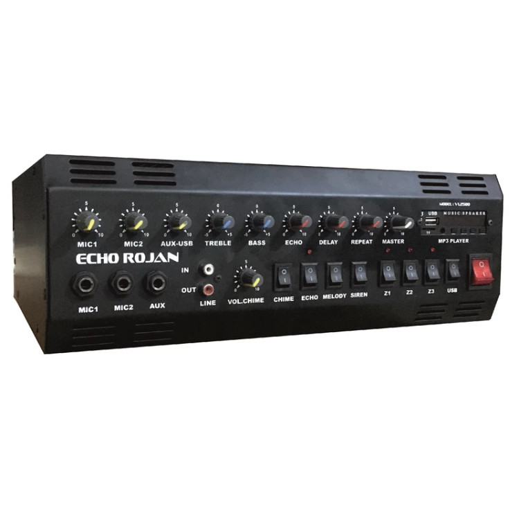 اکو آمپلی فایر Rojan VL2500 از سری تجهیزات صوتی است که دارای 2 ورودی میکروفون با ولوم کنترل صدای جدا شده دارد که یک میکروفون AUX با ولوم کنترل صدای مجزا و نیز خروجی به منظور اتصال به دستگاه های دیگری نظیر دوربین است. این اکو امپلی فایر توانایی اتصال برق 12 ولتی (برق ماشین) و همینطور امکان پخش و ضبط صدا به صورت MP3 و SAVE در کارت SD و نیز پورت USB و موج رادیویی FM وهمچنین توانایی پشتیبانی از بلوتوث را دارد.امپلی فایر مدل VL1800 امکان وصل شدن به صورت همزمان به بلندگوهای پیجینگ دار و بلندگوهای اهمی را نیز دارد. در این امپلی فایر قدرت خروجی صدا 250 وات واقعی است و دارای کلید پیش رنگ (Chime) و آژیر و ملودی است. در این مطلب سعی کردیم با معرفی کامل امپلی فایر VL2500 اطلاعات کاملی را در اختیار کاربران قرار دهیم در صورتی که شما نیز به منظور اجرای پروژه های خود به یک امپلی فایر با کیفیت نیاز دارید در ادامه با ما همراه باشید تا با بررسی دقیق مشخصات فنی و امکانات این امپلی فایر به شما در انتخاب درست و متناسب با زمینه نیازتان کمک کنیم.