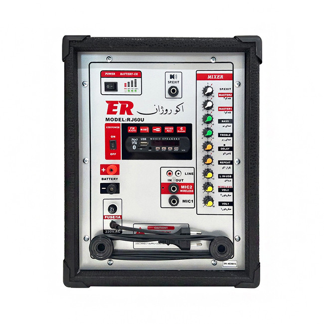 دارای دو بلندگوی 6 اینچ میباشد. این کالا دارای سیستم فلش مموری و رکوردر میباشد. پرتابل شارژی RJ 60U دارای ورودی کمکی AUX و دو ورودی میکروفن که به آن میتوان میکروفن سیم دار و یا بیسیم متصل کرد. وجود باطری داخلی 12 ولت 4.5 آمپرساعت این امکان را به مصرف کننده میدهد تا به طور سیار از اکو پرتابل اکوروژان استفاده کند. این دستگاه مناسب مراسمهای خانگی و سالنها با جمعیت حدود 100 نفر میباشد. این دستگاه علاوه بر شارژ و برق مستقیم با باتری بیرونی نیز کار میکند. این دستگاه با شارژ، برق و حتی باتری کار میکند و تمام نیاز شما را رفع میکند.