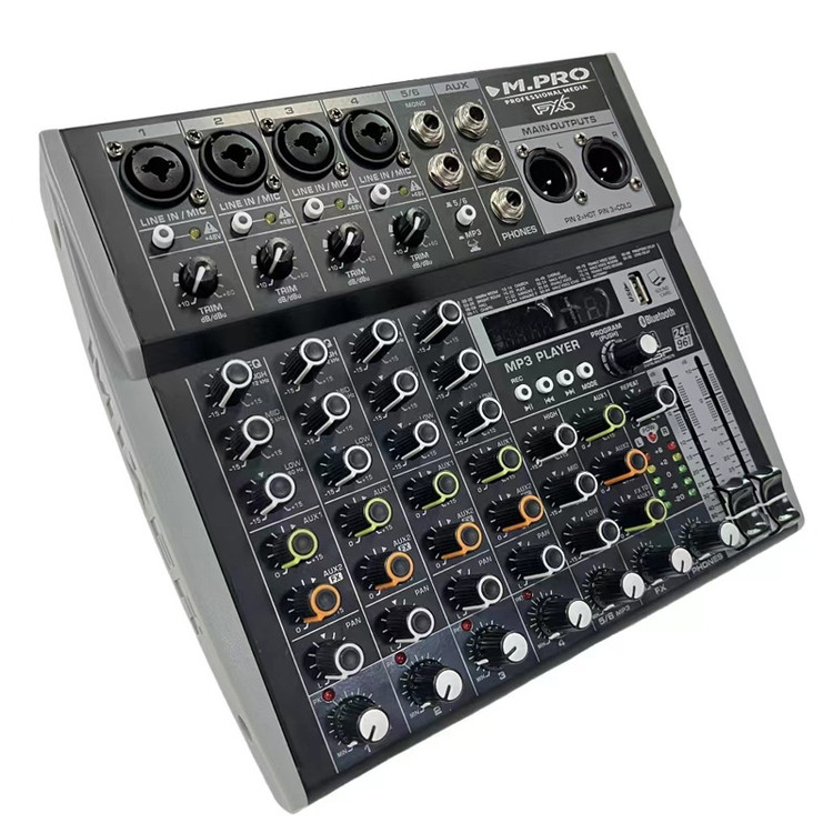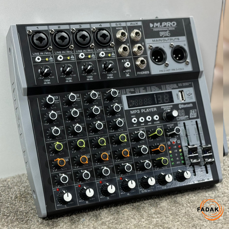 میکسر ام پرو مدلFx6، میکسری با 6ورودی لاین که 4 ورودی آن با درگاه کمبو (XLR- TRS) است که هر لاین به صورت جداگانه، کنترل میزان ِ گین ورودی، تنطیم اکولایزر با 3 ولومِ (HIGH و LOW و MID) را در اختیار شما قرار می دهد.