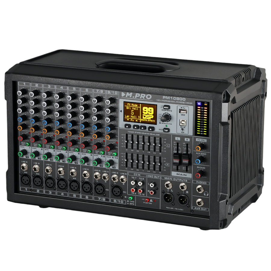 پاور میکسر صندوقی ام پرو مدل MPRO PM10800 تایوانی از بهترین پاور میکسرهای موجود در بازار می باشد که از لحاظ کیفیت میکسر و پاور آمپلی فایر بی رقیب می باشد. این پاور میکسر 10 کانال ورودی مونو و استریو دارد و از ورودی بلوتوث و فلش مموری جهت پخش و ضبط نیز پشتیبانی می کند. همچنین کارت صدای داخلی خروجی USB جهت اتصال به کامپیوتر را فراهم کرده است. افکت های دیجیتال آن از نوع سری 3 دایناکورد است و پاور آمپلی فایر آن استریو با اکولایزر خطی برای هر کانال بصورت مجزا می باشد. پاور میکسر ام پرو PM10800 از دو عدد آمپلی فایر مجزا تشکیل شده است که توان خروجی کلی 1600 وات است و هریک از آمپلی فایرها 800 وات توان دارد.